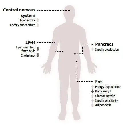 In the fat tissue, FGF21 enhances uptake of glucose from the blood stream into the fat cells. FGF21 also promotes insulin sensitivity.1